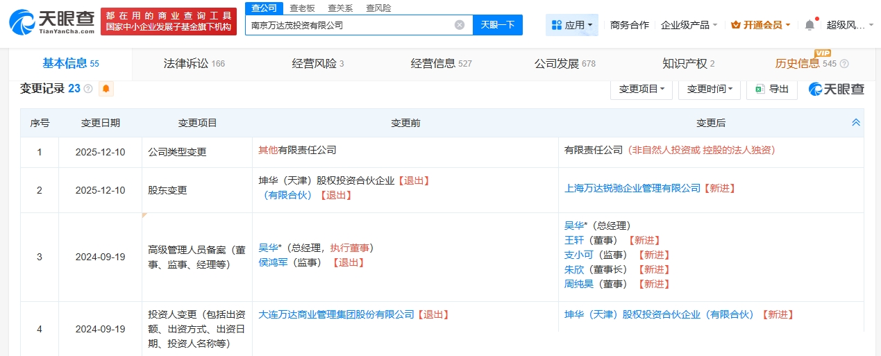 近日,南京万达茂投资有限公司发生工商变更,原股东坤华(天津)股权投资合伙企业(有限合伙)退出,新增上海万达锐驰企业管理有限公司为全资持股。变更记录显示,2024年9月,大连万达
