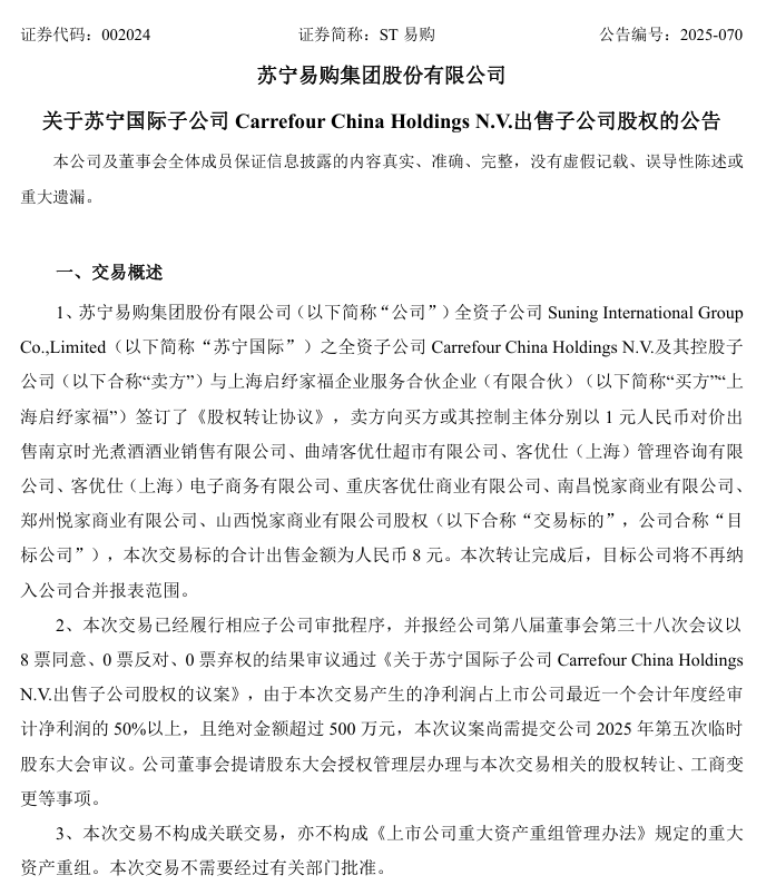 12月10日晚间,苏宁易购(002024)发布公告,公司的全资子公司苏宁国际的全资子公司Carrefour China Holdings N.V.及其控股子公司与上海启纾家福企业服务合伙企业签订了《股