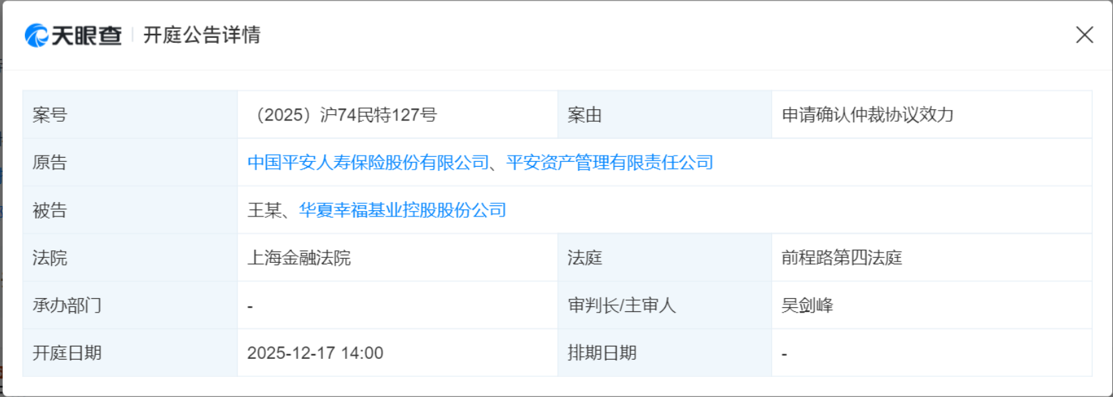 12月10日,天眼查信息显示,平安人寿及平安资产作为原告起诉华夏幸福基业控股股份公司及“王某”,案由为“申请确认仲裁协议效力”,上诉法院为上海金融法院,开庭日期为12月17
