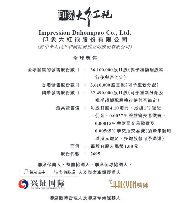 12月12日早间,印象大红袍在港交所公告,公司拟全球发售约3610万股股份,香港发售股份361万股,国际发售股份3249万股,另有15%的超额配股权;发售价每股3.47~4.10港元;预期股份将