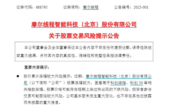 12月11日晚间,摩尔线程发布风险提示公告称,近期公司股票涨幅较大,显著高于科创综指、科创50等相关指数涨幅。股票价格可能存在短期上涨过快出现的下跌风险,投资者参与交易