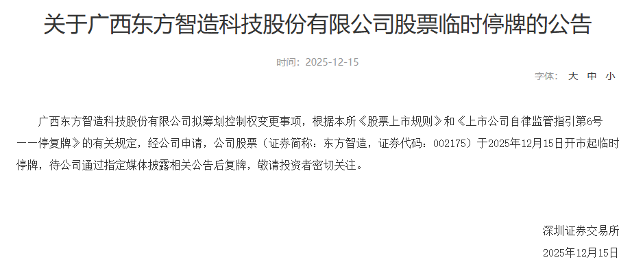 12月15日,深交所发布公告称,广西东方智造科技股份有限公司拟筹划控制权变更事项,根据有关规定,经公司申请,公司股票于2025年12月15日开市起临时停牌,待公司通过指定媒体披露