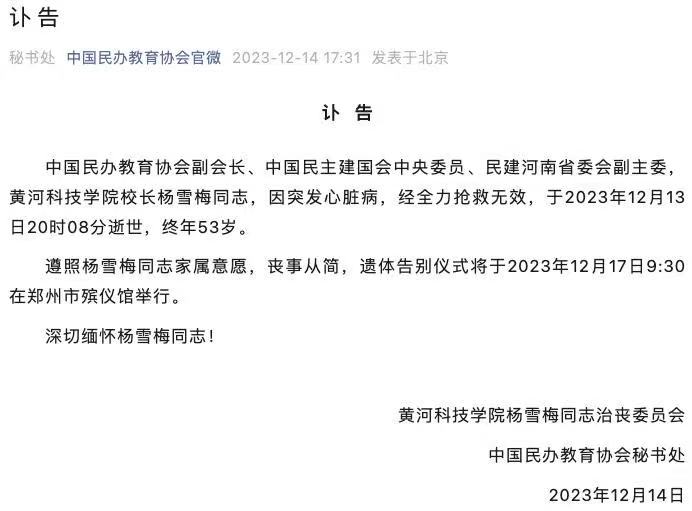 中国民办教育协会副会长、中国民主建国会中央委员、民建河南省委会副主委,黄河科技学院校长杨雪梅同志,因突发心脏病,经全力抢救无效,于2023年12月13日20时08分逝世,终年53