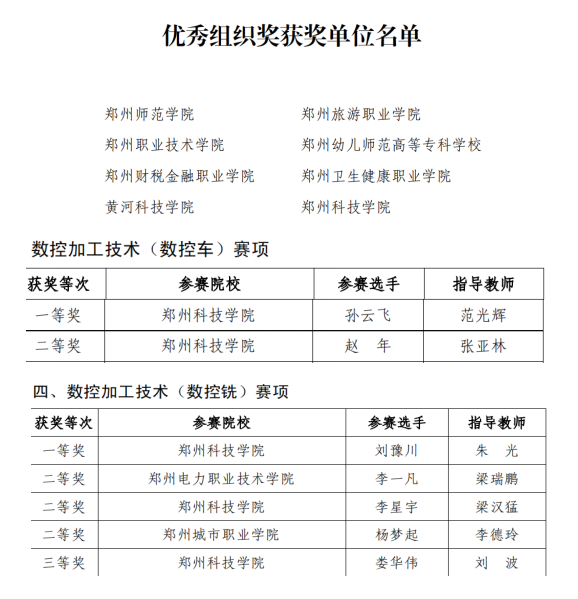 近日,郑州市教育局公布了第八届郑州地方高校职业技能竞赛结果的通知。郑州科技学院荣获优秀组织单位奖,其中,实践中心教师朱光、范光辉、张亚林、梁汉猛、刘波等指导的学