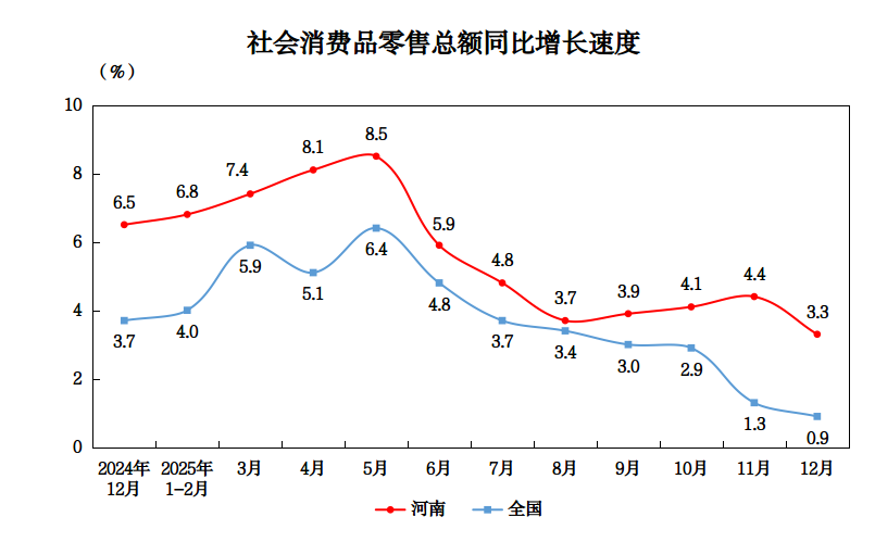 2025年,河南省社会消费品零售总额29090.50亿元,同比增长5.6%,高于全国1.9个百分点。其中,限额以上单位消费品零售额7984.99亿元,增长8.2%。