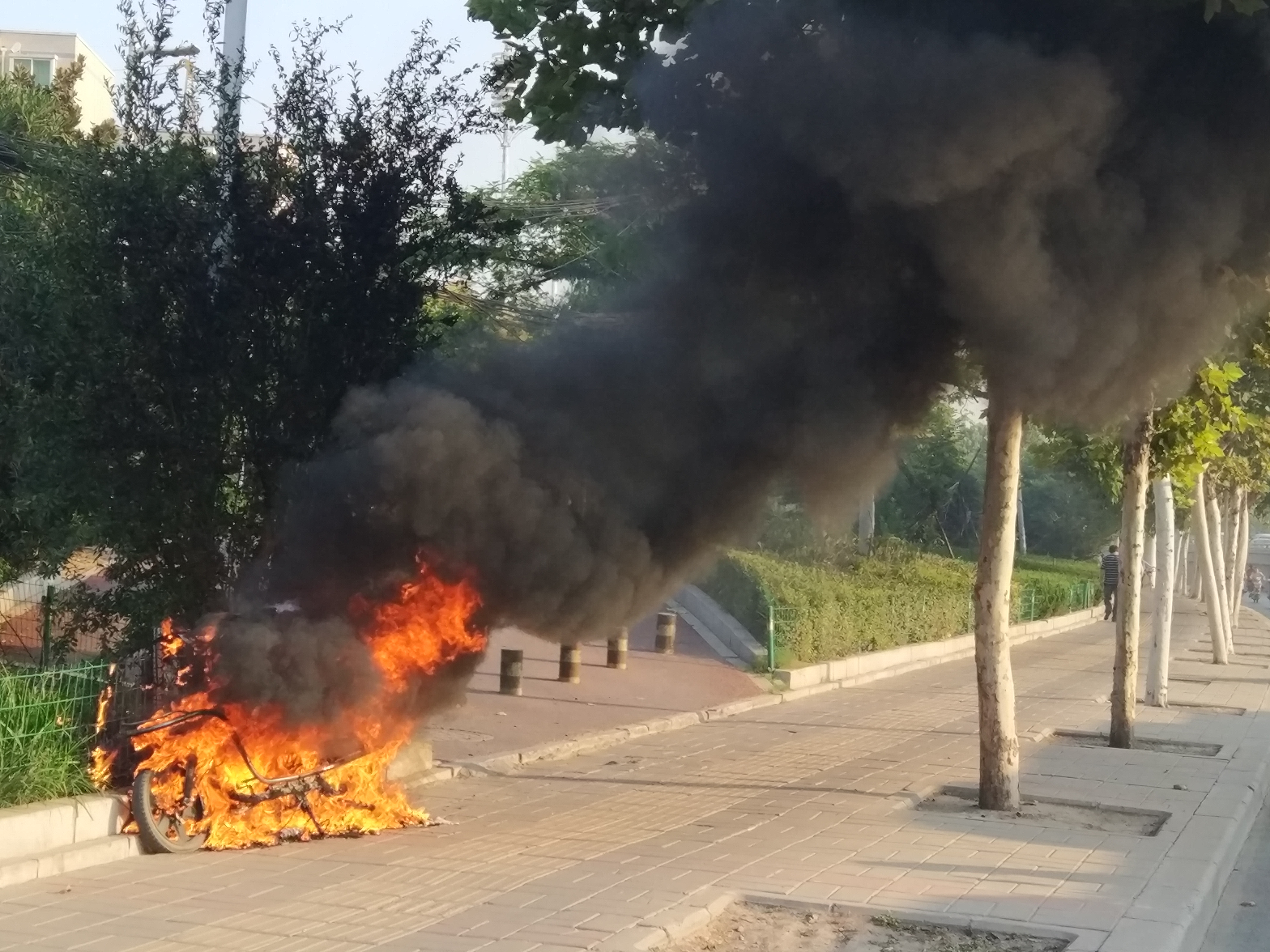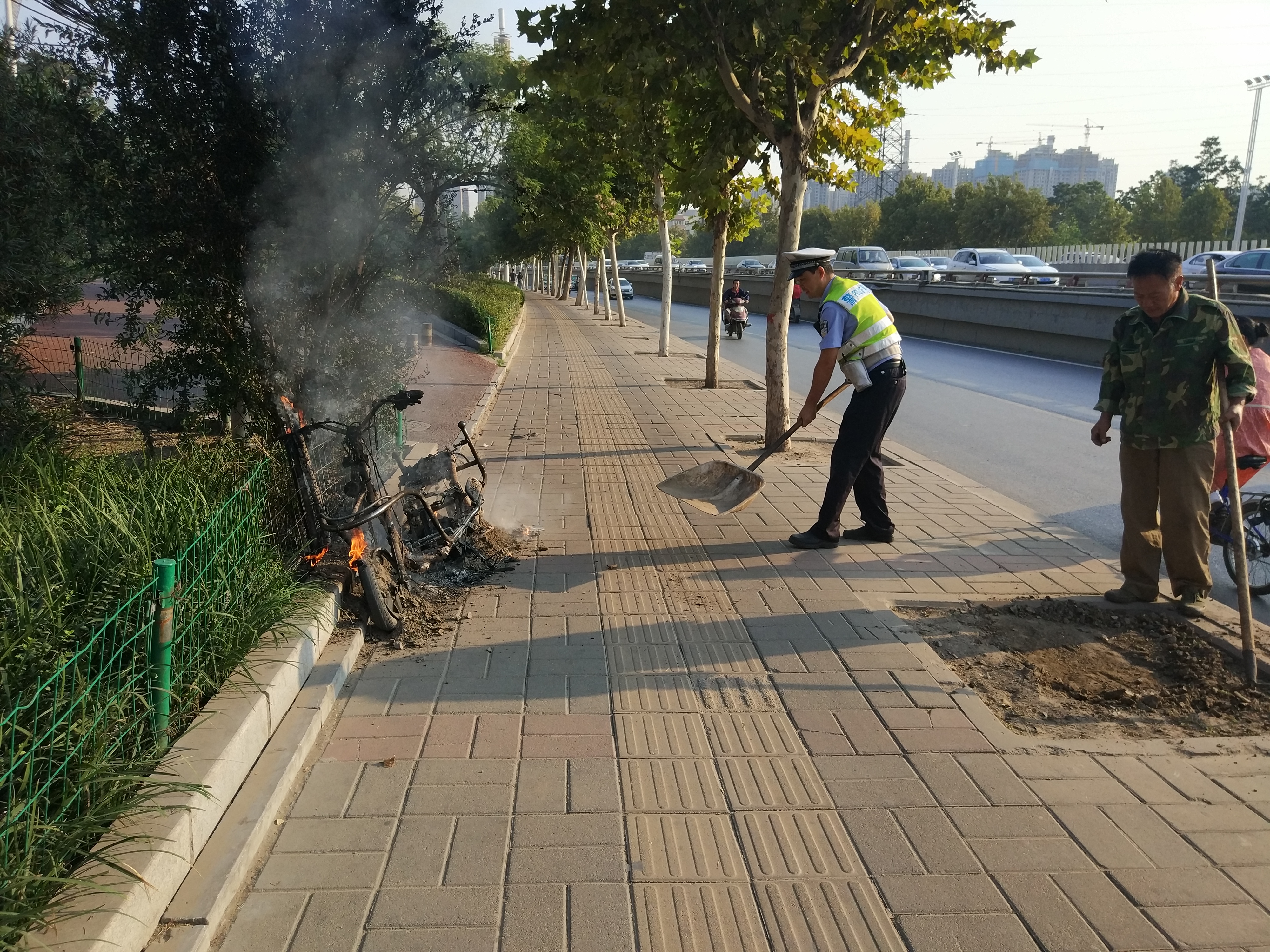 9月9日早晨7时50分左右,在郑州市中原区西三环建设路交叉口南约200米处,一辆停泊路边的电动车失火,很快浓烟翻滚,一位巡逻民警见状,急忙捧土施救。