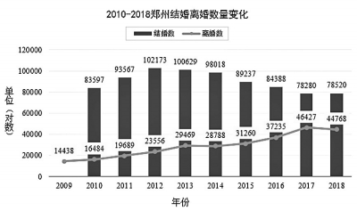 数据显示,2010年,郑州市的离婚登记数为16484对,之后一路上升:2011年19689对;2012年23556对;2013年29469对;2014年,郑州市离婚人数出现了连续上升7个年头后的首次“低头”,为28788对。不过,之后又是连续3年的跳跃式增长:2015年离婚31260对,2016年离婚37235对,2017年离婚46427对。2018年44768对的离婚人数比2017年有所减少,而相对于此前的其他年份来说,依然是“高高在上”。
