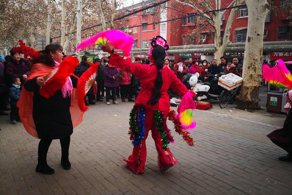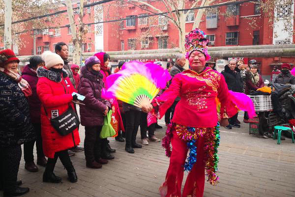 原标题:卖菜大叔扮大妈 郑州街头扭秧歌吸引路人