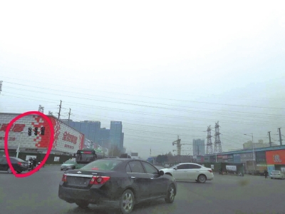 近日,有多名郑州市民向大河报反映,每次路过郑汴路与未来路交叉口都要提心吊胆,因为开车沿着未来路由北向南行驶到这个路口时,看不清红绿灯信号,“很多人开车路过这个路口都不知道该咋走,这个红绿灯的位置有点奇怪,设在了车行道的偏东方向,从北向南行驶的车主,要把头伸出窗外往东看,才能看清红绿灯”(如图)。