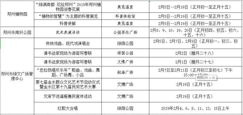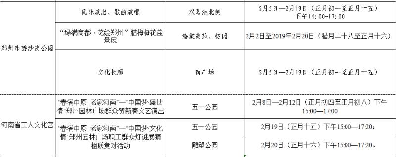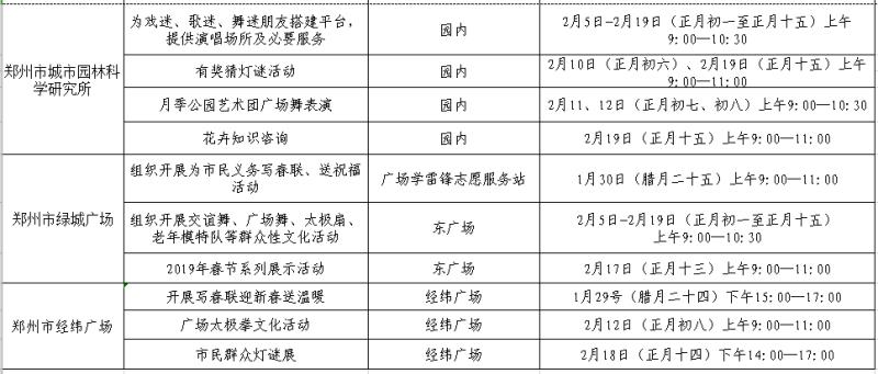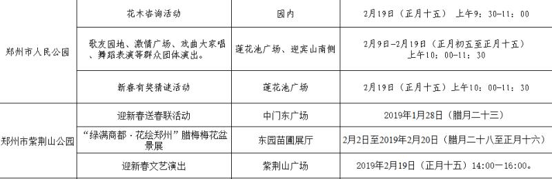 记者从郑州市园林局获悉,今年春节及元宵节期间,郑州各大公园、广场将举办丰富多彩的文化娱乐活动,为郑州增添节日气氛。