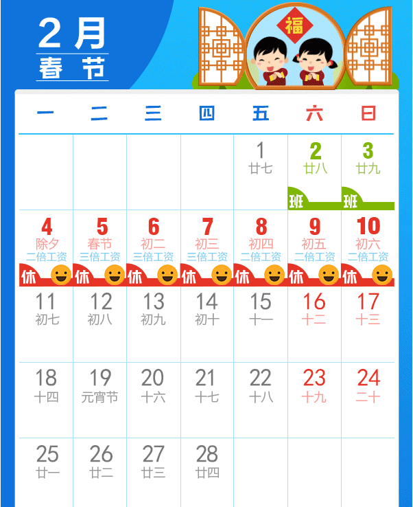 2019年春节假期:2月4日到2月10日(除夕到正月初六)放假调休,共7天。2月2日(周六)、2月3日(周日)上班。