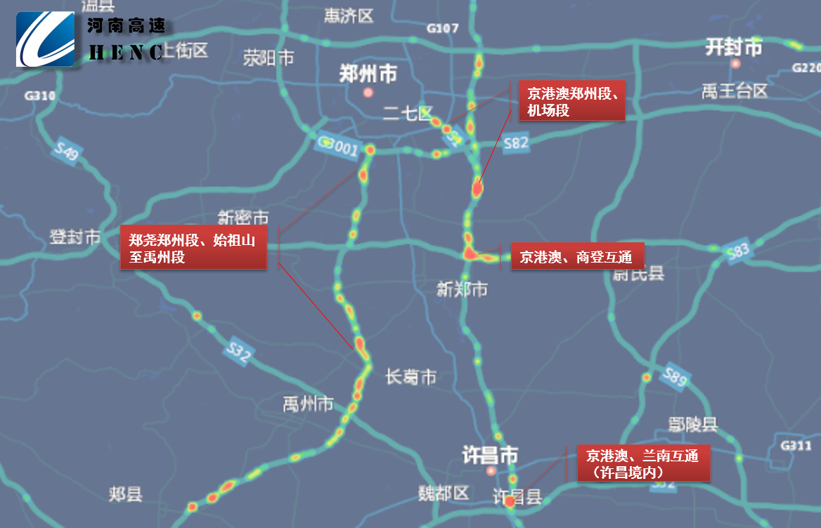 省内车流密度大且易堵路段:京港澳高速与连霍高速交汇刘江枢纽、郑州市内主要通道与连霍高速接入口、机场高速与京港澳高速交汇处、商登高速与京港澳高速互通处、郑尧高速始祖山隧道段、永登高速与兰南高速互通段。