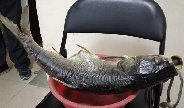 今天下午,在郑州市纬二路27号院内的健身器旁,出现了一个红色的塑料袋。巡逻到这里的金水区花园路办事处巡防队员发现后,怀疑是前来健身的居民遗忘的物品,打开一看,发现里面竟是一条风干的大鱼,足有十几斤重。