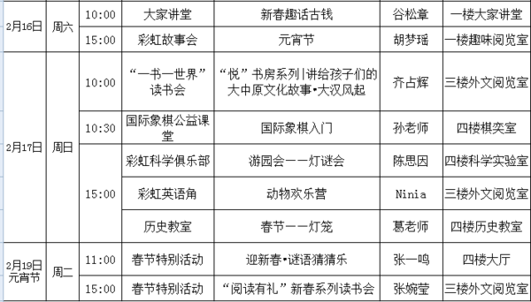 元宵节当天,也将举办两场“灯谜大会”,由馆员带领小读者一起了解春节习俗、朗诵春节古诗词、学习灯谜小知识、参与灯谜竞猜,感受传统文化,体验浓浓的年味儿,获奖的小读者还将获得新年小礼品。