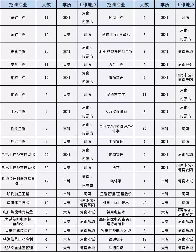 (1)安家费政策。 为加大人才吸引力度,引进高层次紧缺专业人才,2019年校园招聘对部分院校学生(仅限2019年应届生毕业生)实行安家费政策。一是对于“双一流”院校专业及以上层级或“211工程”及以上层次院校大学毕业生(含中科院等国家级研究机构毕业的研究生)。本科生安家费3万元、硕士生安家费4万元、博士生安家费5万元;二是二本及以上煤炭、化工、装备制造、有色金属主体专业大学毕业生。本科生安家费2万元、硕士生安家费3万元、博士生安家费4万元;煤炭主体专业包括采矿工程、安全工程、地质工程、测绘工程、土木工程(矿建)、矿山机电,化工主体专业包括化学工程与工艺(含工业催化)、过程装备与控制、电气工程及其自动化、测控技术与仪器;装备制造主体专业包括机械制造及其自动化、化工工艺、材料工程、电气工程及其自动化;有色金属主体专业包括冶金工程、矿物加工工程、机械制造及其自动化、电气工程及其自动化专业。上述院校招聘引进的毕业生签订就业协议的同时,签订安家费协议,根据协议规定发放安家费。