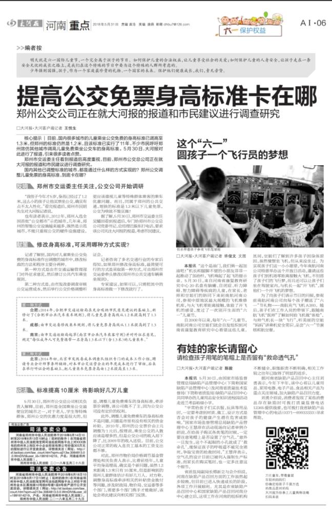 2018年6月8日,大河报刊发《调高公交免票身高线提上日程》,郑州市交运委把调高儿童乘坐公交免票身高标准一事提上日程。