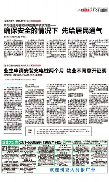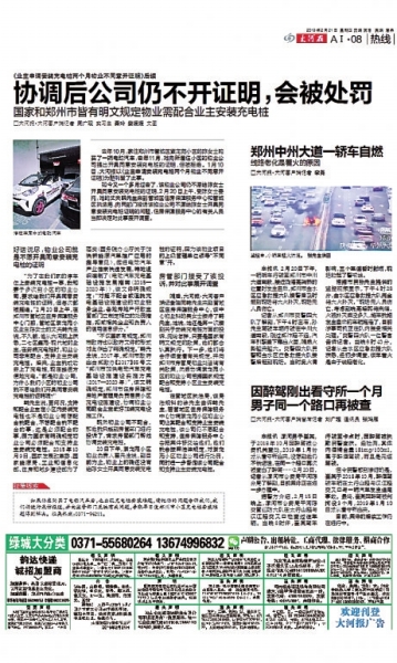 2月20日,大河报·大河客户端记者又陪同业主到房管部门反映物业不配合安装充电桩的事,2月21日,本报又以《协调后公司仍不开证明,会被处罚》为题报道此事。
