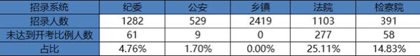 从未达到开考比例的职位类别来看,法院系统成为"重灾区",全省2019年共招录1103人,未达到开考比例的招录名额为277人,占招录总人数的25.11%,检察院系统58个招录名额未达到开考比例,占招录总人数的14.83%,纪委系统未达到开考比例的招录名额为61人,占招录总名额的4.76%。