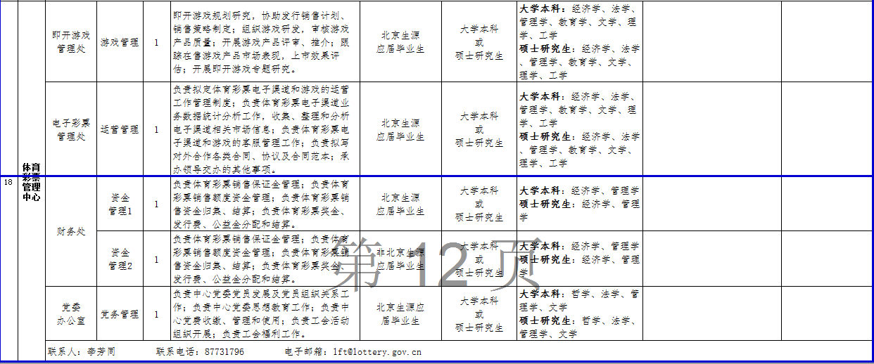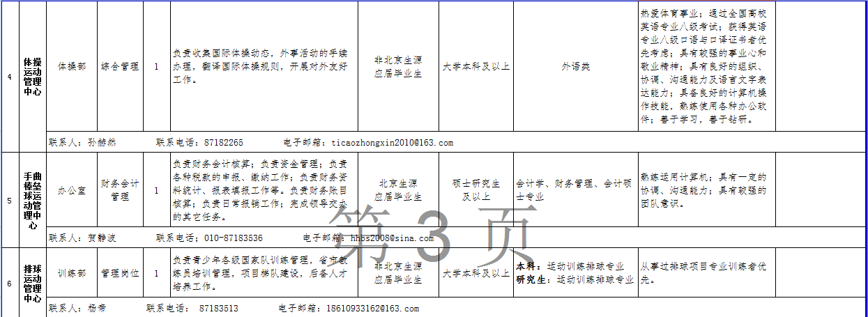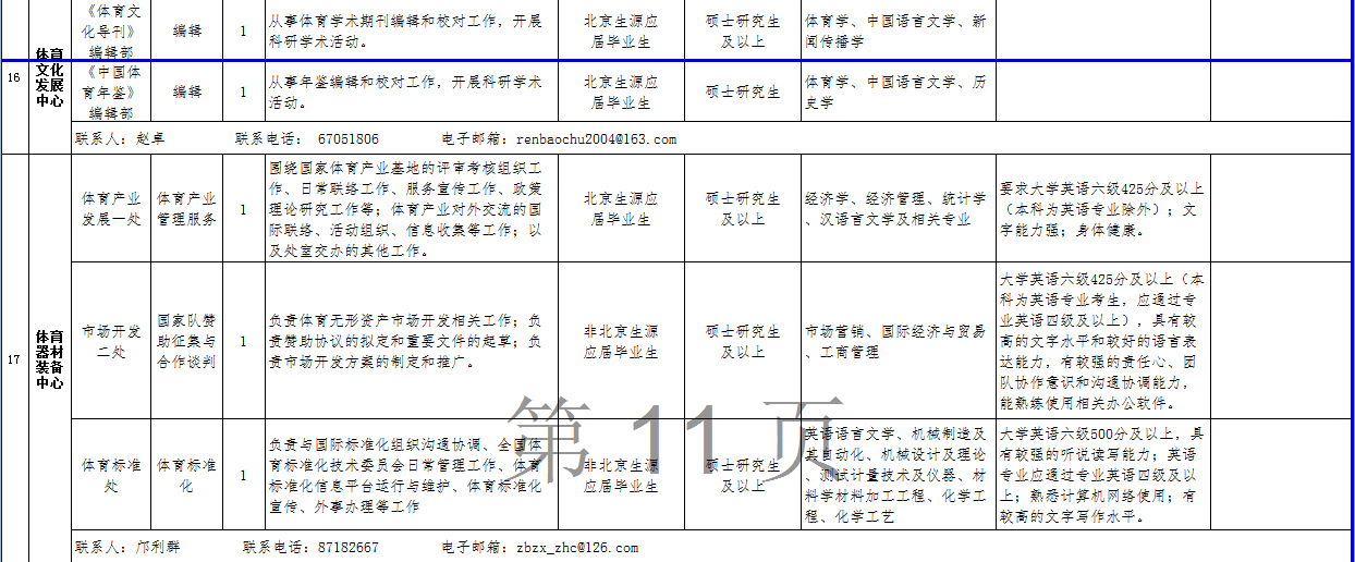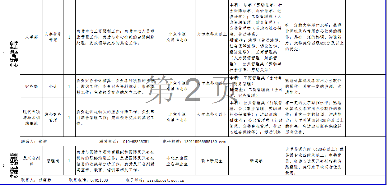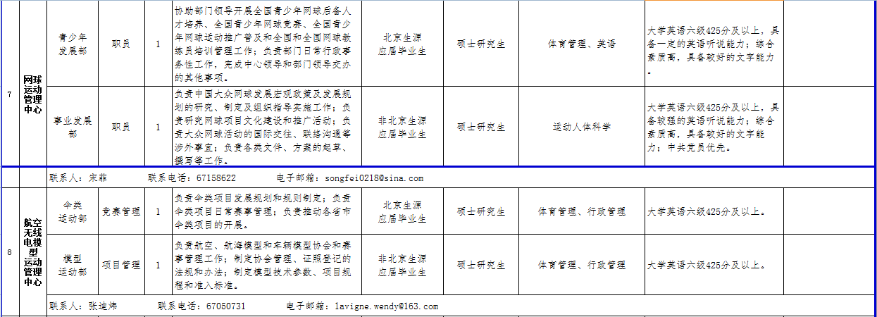 (三)关于考务、政策等方面的信息可在公开招聘专栏中查询,也可咨询体育总局人力中心(咨询电话:67159766、87182654、87182180)。关于招聘单位、招聘岗位、岗位条件及报名等方面的信息可直接咨询各招聘单位(联系人及电话详见岗位情况一览表);笔试结束后的面试、考核、体检等方面工作请直接与各招聘单位联系。