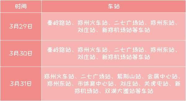 郑州地铁集团运营分公司提醒乘客,根据3月31日赛事安排,全程、半程马拉松赛参赛选手出行时间预计在6:00~8:00,五公里小马拉松(含亲子马拉松和情侣马拉松)参赛选手出行时间预计在7:00~9:30。届时市体育中心站、会展中心站客流预计会有明显增长,车站将适时启动客流控制措施,请乘客合理安排出行时间,尽量错峰出行。