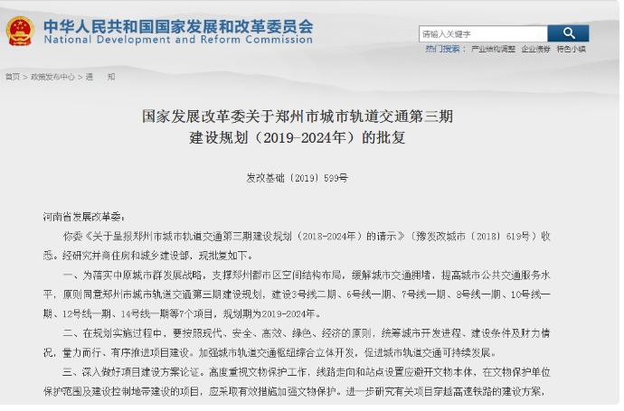 国家发改委发布郑州市城市轨道交通第三期建设规划(2019-2024年)的批复,原则同意郑州市城市轨道交通第三期建设规划,建设3号线二期、6号线一期、7号线一期、8号线一期、10号线一期、12号线一期、14号线一期等7个项目,规划期为2019-2024年。新建项目总投资1138.94亿元。