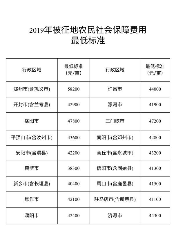 近日,河南省人力资源和社会保障厅下发《关于公布2019年被征地农民社会保障费用最低标准的通知》。根据《河南省人民政府关于调整河南省征地区片综合地价标准的通知》和《河南省人力资源和社会保障厅 河南省财政厅 河南省自然资源厅关于对被征地农民参加基本养老保险实施补贴的意见》,经省政府同意,将2019年各地征地区片综合地价中被征地农民社会保障费用最低标准予以公布。