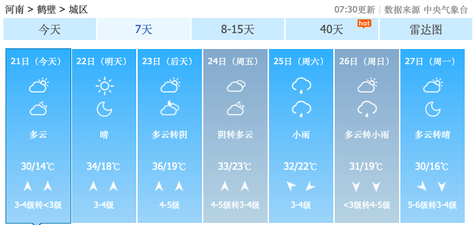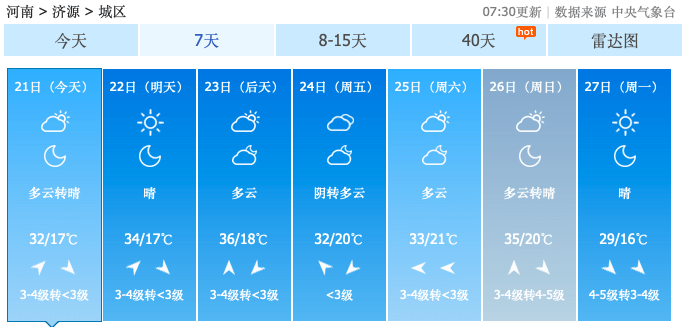 22到23日,全省晴天间多云,偏南风3到4级,北中部阵风5到6级。全省大部分地区最高温度33到35℃,北中部将出现干热风。