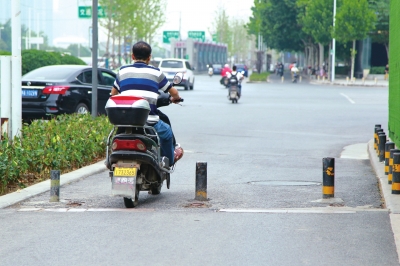河南商报记者探访时正值早高峰,金水路上非机动车车流量较大,不少电动车车主为了能尽快通过,在隔离桩前你争我抢,场面惊险。