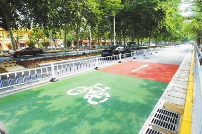 (记者崔文通讯员扶涛涛/文记者邓万里/图)7月11日,郑州市主干道非机动车道首次铺设的彩色路面呈现在市民眼前,彩色路面上喷绘有白色的自行车和导向箭头交通标志,醒目美观,有效提示非机动车行驶路线。