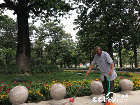 焦桐第二代守护人,77岁的魏善民老人正在清理落叶。(记者 王莉莉 摄)