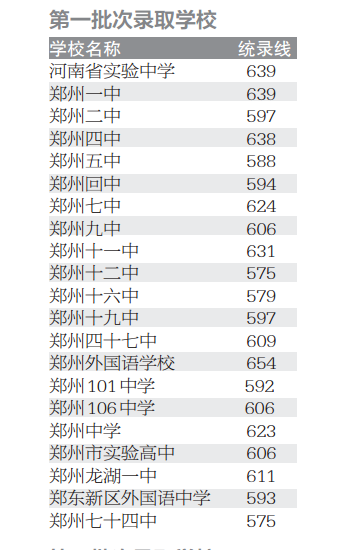 按照河南省教育厅相关文件要求,郑州市教育局结合郑州市区普通高中招生计划的实际情况,确定2019年郑州市区第一批次最低录取分数线为575分,郑州市区第二批次最低录取分数线为501分,郑州市区普通高中最低录取控制分数线为381分。
