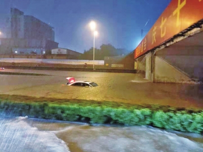 郑州东风南路陇海快速向南的铁路涵洞,水没顶,断行。记者郭兵摄影