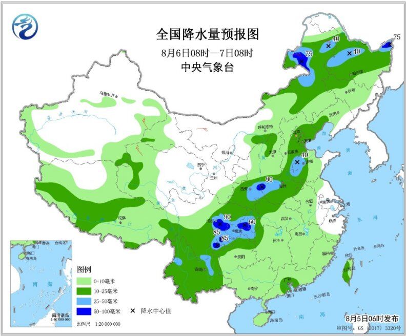 6日,全省阴天,大部分地区有分散性阵雨、雷阵雨,西部部分地区有中雨,局部有大雨或暴雨并伴有短时强降水等强对流天气。 7日,全省阴天,大部分地区有分散性阵雨、雷阵雨。