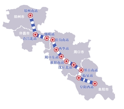 郑阜铁路以河南省郑州市为起点,经开封市(尉氏县)、许昌市、周口市至线路终点安徽省阜阳市,线路全长约281公里,其中河南境内正线长度为211.764公里,正线设计为双线高速铁路、速度目标值为每小时350公里。