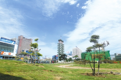 广场西侧的围挡已被拆除,部分区域覆盖了草皮,种上了油松、棕榈等树木