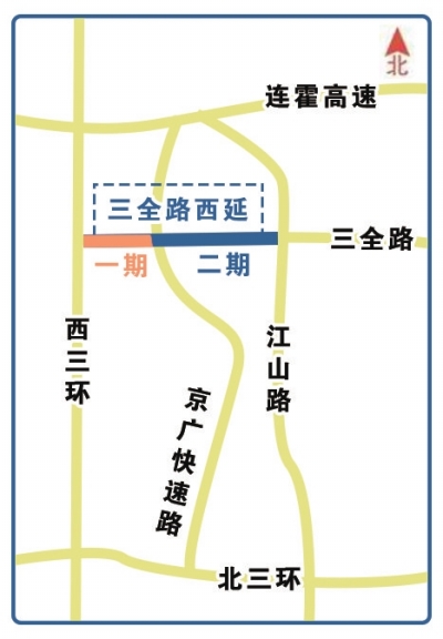 8月27日,河南商报记者在西三环北延与三全路交叉口注意到,待三全路西延道路建成后,车主穿越金水区、惠济区一路行驶可进入高新区北部区域,郑州西北部区域与主城区的联系将更加紧密,北三环彩虹桥的通行压力也将得以缓解。