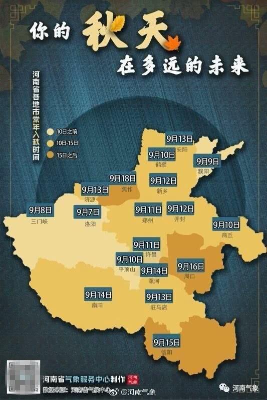 按照我省各地常年入秋时间来看,最晚入秋的地区是焦作,为9月18日,郑州通常在9月11日入秋。
