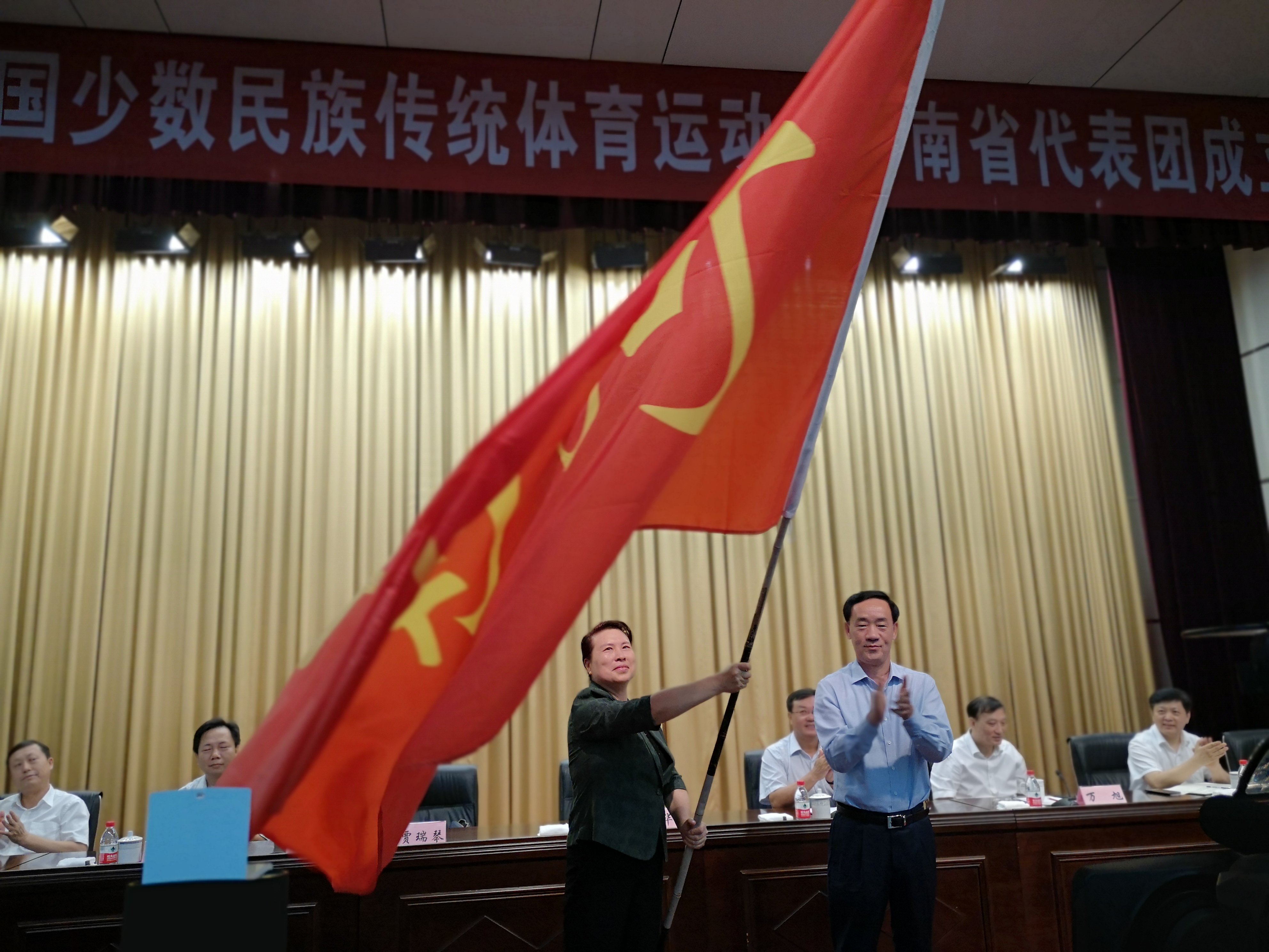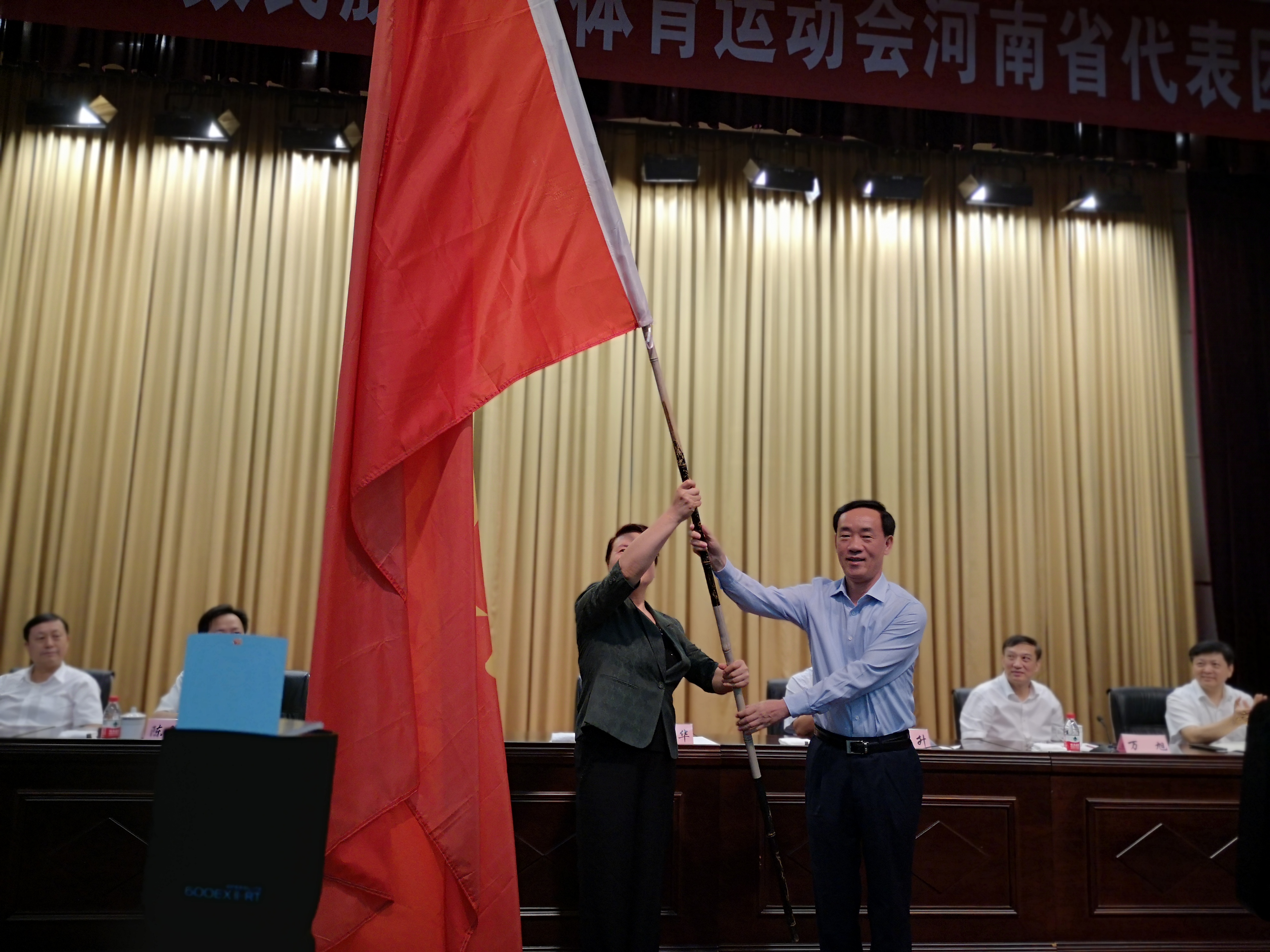 大会上举行了授旗仪式,省民族宗教委介绍了河南省筹备参加第十一届全国民族运动会工作情况,教练员、运动员代表作了表态发言。