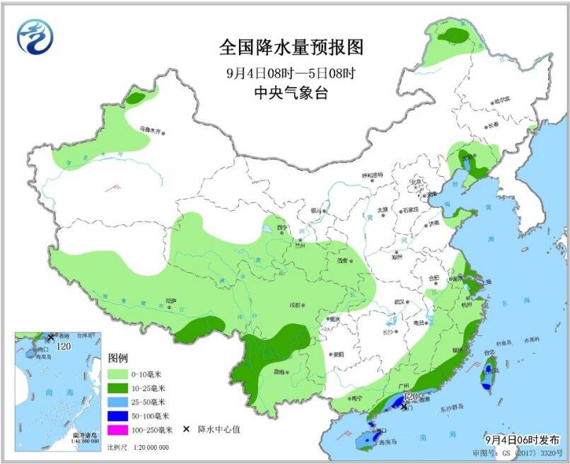 受台风和热带低压影响,9月4日8时至5日8时,福建东部、广东南部、海南岛、台湾岛等地部分地区有中到大雨,其中,广东南部沿海、海南岛东北部、台湾岛中南部等地部分地区有暴雨或大暴雨(100~120毫米)。台湾以东洋面及东海东南部偏东的部分海域风力可达9~10级、阵风11~12级。