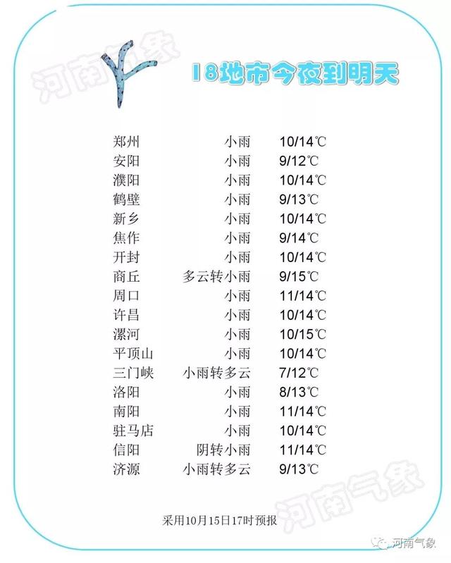 今天夜里,全省阴天,淮河以北大部分地区有小雨,其中三门峡、洛阳、济源三地区和南阳地区西部局部有中雨。