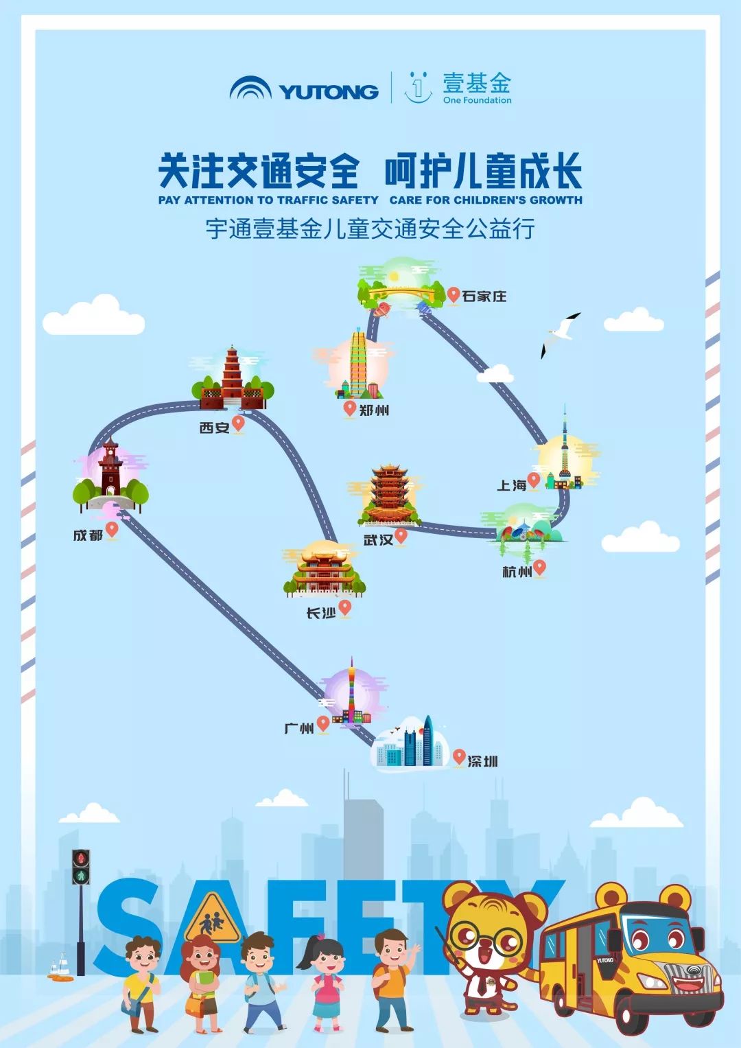 这次寓教于乐的“宇通&壹基金儿童交通安全公益行”一共会持续2个月,将陆续走进国内10大城市:郑州、石家庄、上海、杭州、武汉、长沙、西安、成都、广州、深圳 ,覆盖100所小学和幼儿园,为5万名孩子提供系统的安全教育,真正在全国范围内实现“关注交通安全,呵护儿童成长”!