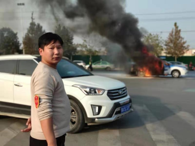 此时王向东毫不犹豫地拿起一个灭火器跑了出去,到了场站外面,竟然发现路口中间有一辆纯电动型出租车正冒着滚滚黑烟着起大火。