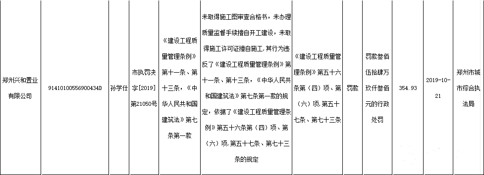 郑州兴和置业有限公司为河南振兴房地产(集团)有限公司投资公司,未取得施工图审查合格书,未办理质量监督手续擅自开工建设,未取得施工许可证擅自施工,其行为违反了《建设工程质量管理条例》第十一条、第十三条,《中华人民共和国建筑法》第七条第一款的规定,依据《建设工程质量管理条例》第五十六条第(四)项、第(六)项,第五十七条、第七十三条的规定,于10月21日被处罚354.93万元。