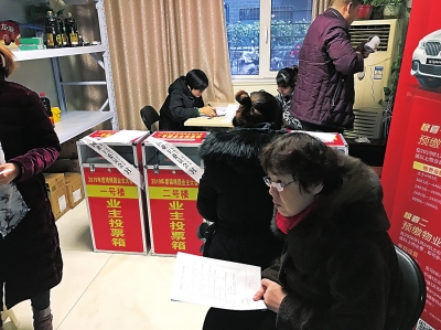 在2号楼的投票点,记者看到贴有业委会公章封条的4个投票箱按楼号一字排好,不少业主正拿着《业主大会表决票》填写。