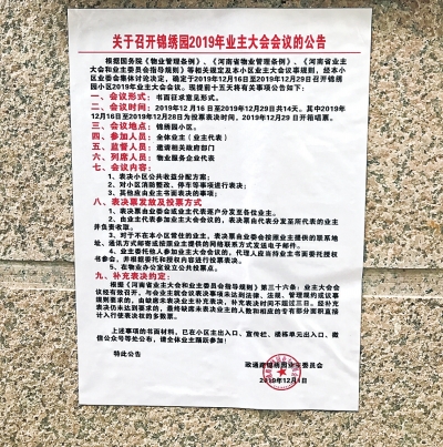 16日上午,记者走进锦绣园小区大门,目光便被小区悬挂的“公共收益属于全体业主”“预祝锦绣园2019年度业主大会胜利召开”等横幅所吸引。记者注意到,在小区南大门门岗处的显著位置,张贴着《关于召开锦绣园2019年业主大会会议的公告》,公告明文指出此次会议形式为书面征求意见形式,会议时间为2019年12月16日至2019年12月29日,会议内容为表决小区公共收益分配方案等,落款时间为2019年12月1日。