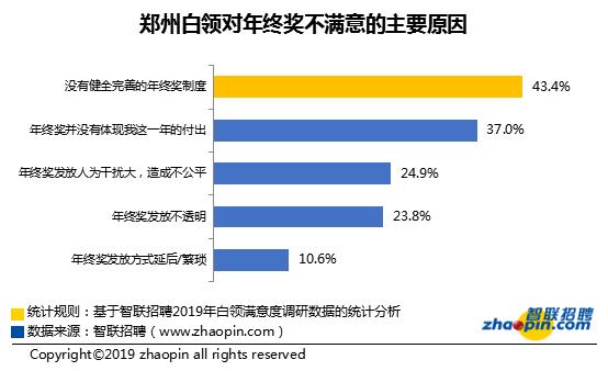 总体来看,2019年郑州白领的年终奖均值在全国范围内比较靠后,而且满意度低于全国平均水平,究其原因,超过一半的郑州白领认为年终奖这一关乎“辛勤工作一年应有的回报”,所在企业却没有健全完善的年终奖制度,并认为没有体现出自己过往一年的付出。因为对年终奖有不满情绪,白领们在缺少安全感的经济环境中,因年终奖不理想而选择跳槽的比例有所上升。