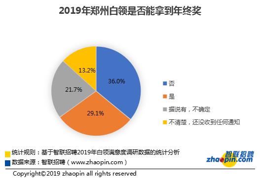 调研数据显示,参与调查的郑州白领中有29.1%表示能够拿到年终奖,与2018年的38.2%相比,有所下滑。另外,有36%的郑州白领表示拿不到年终奖,回答“据说有,不确定”的占比21.7%。