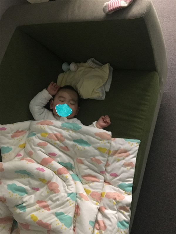 (七个月大的小宝在妈妈单位的沙发上甜甜睡去)