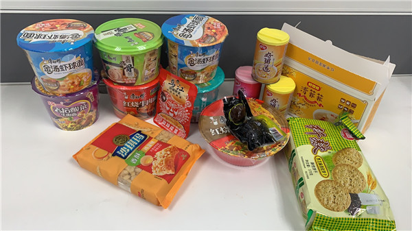 (春节期间为客服值班人员储备的“年夜饭”—泡面、牛奶、八宝粥等方便食品,以及必备的消毒物资)