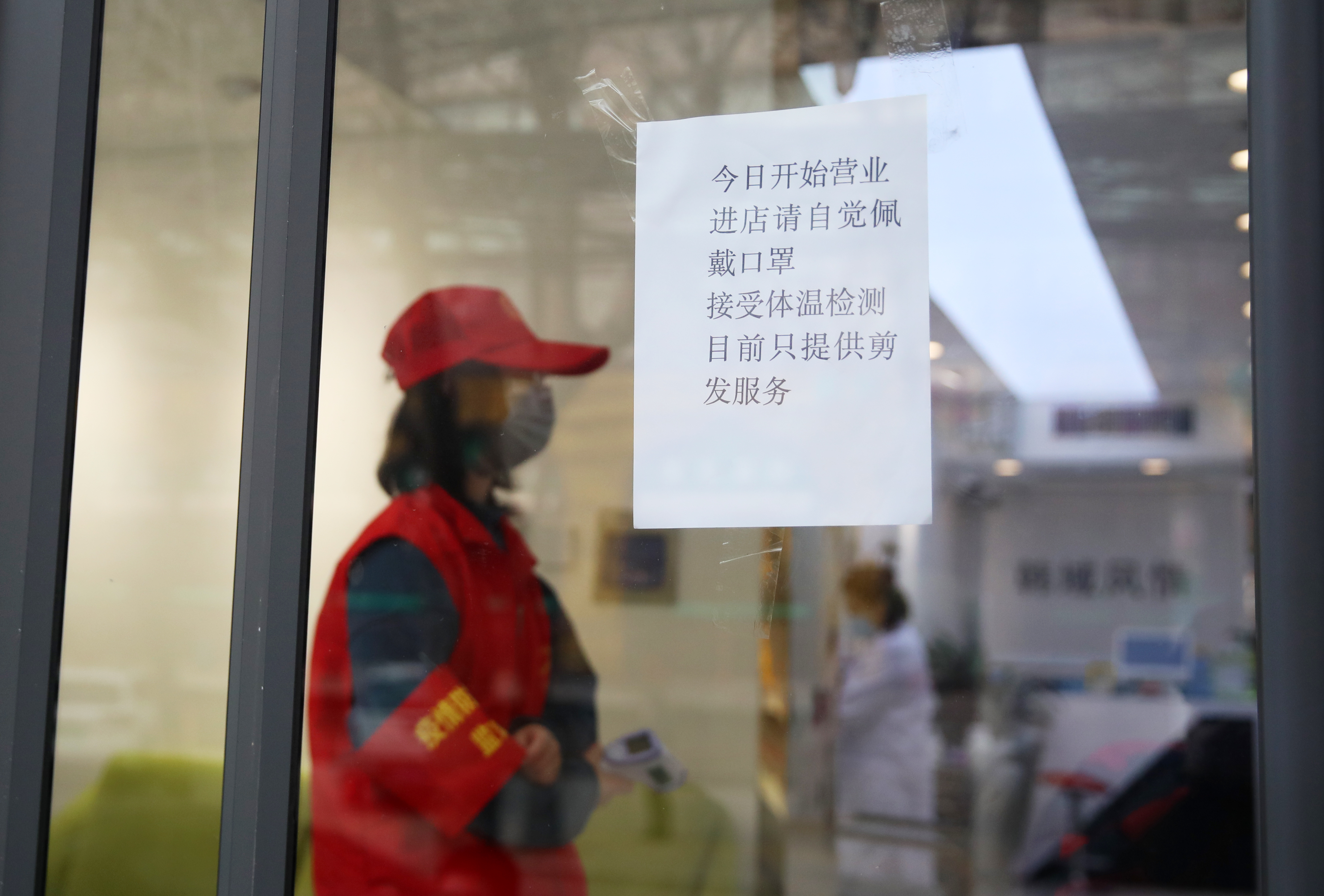 2月24日,郑州经二路与丰产路交叉口附近的韩域风情理发店,一名社区工作人员手持测温仪,对每个进入理发店的测体温。而该理发店只有一名理发师和一名助手。而该理发店一共4个座椅。一名理发师正在为一名女孩剪头发。据他介绍,这是今天上午第3位顾客。该理发店每次只允许一名顾客进店理发。“按照规定,理发师按坐椅数的50%上岗,我们一共有4名家住郑州的理发师,但店里最多只能有两位理发师,其他理发师直接让他们到社区,为一线抗疫人员免费理发了。”该店老板说。